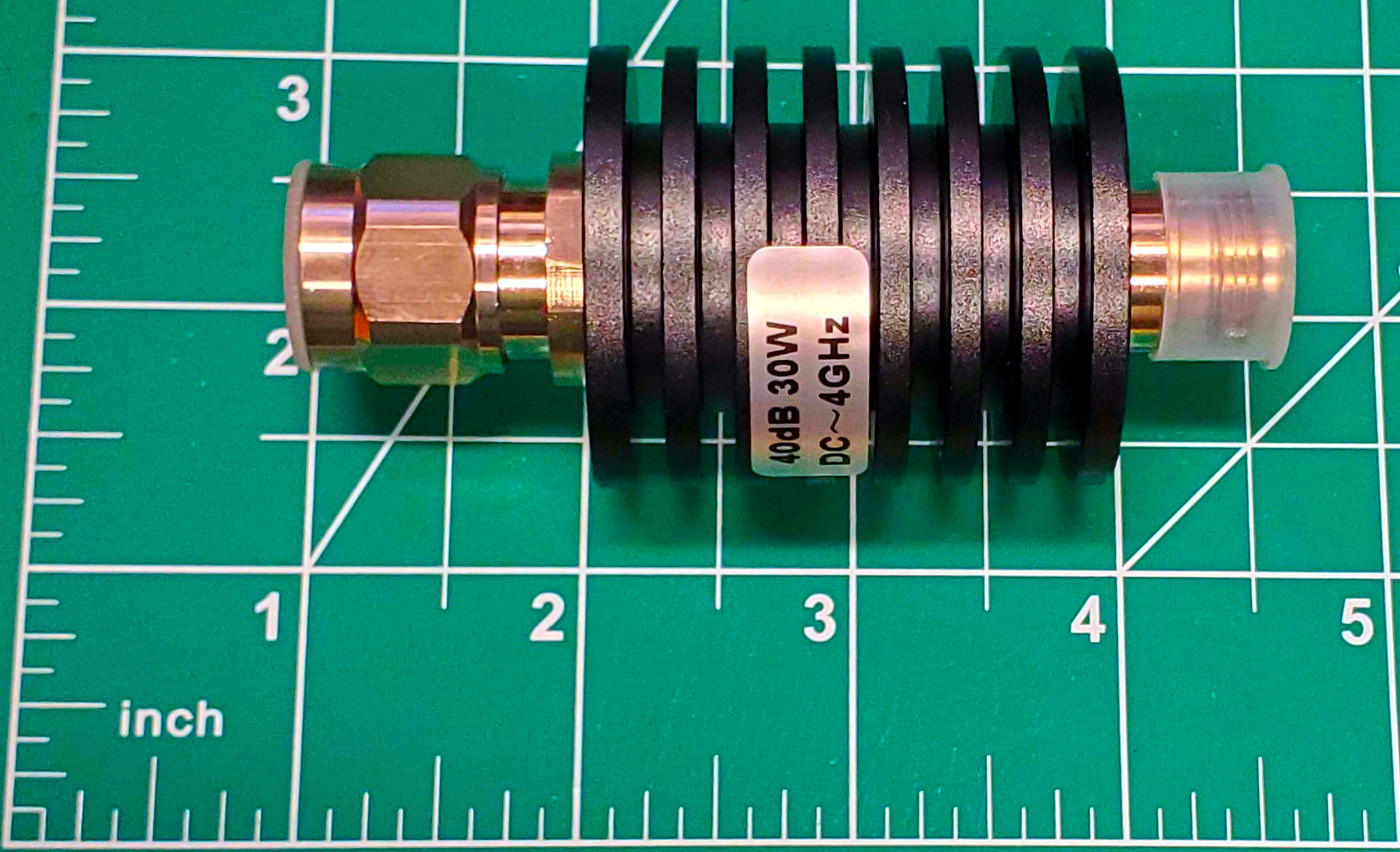 A 40 dB attenuator (Figure 2.6) terminated in \(50~\Omega\) presents a \(50~\Omega\) input impedance. Configure one oscilloscope channel to \(50~\Omega\) input impedance and use a \(50~\Omega\) coaxial cable. The measured signal will be attenuated by 40 dB.