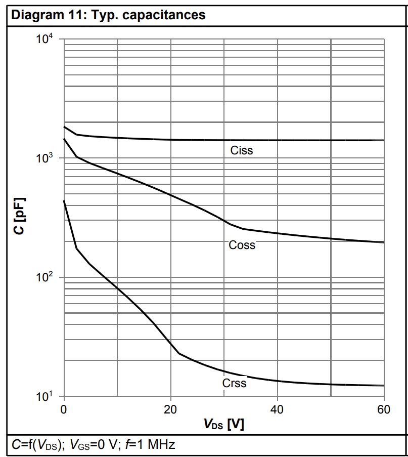 The MOSFET exhibits a nonlinear drain–source capacitance (\(C_{oss}\)) that varies with the applied drain–source voltage \(v_{ds}\). The capacitance variation is shown in Figure 2.3 (Plot #11 in the datasheet).