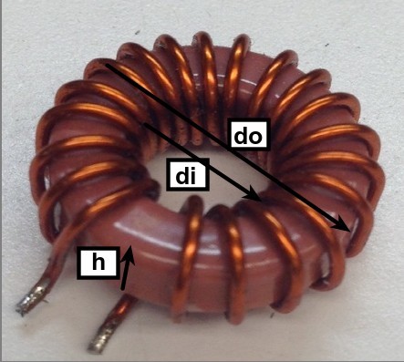 \[L=\underbrace{\frac{N^2h\mu_{0}}{2\pi}\ln\left(\frac{d_o}{d_i}\right)}_{\text{toroidal component}}{+\underbrace{\frac{d_i+d_o}{4}\mu_0\left[\ln\left(8\frac{d_o+d_i}{d_o-d_i}\right)-2\right]}_{\text{single-turn loop component}}} \tag{2.1}\]